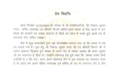 निशांत कुमार नन्दा- वरिष्ठ उपाध्यक्ष एवं श्रीमती किरण-सचिव द्वारा संस्था के बैंक खातों में लगे होल्ड को हटवाने एवं संस्था सदस्यों के हितों को ध्यान में रखते हुये अपने पद से त्यागपत्र दिया