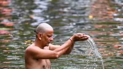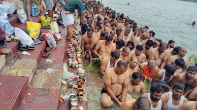 शीतलदास की बगिया में उमड़ी आस्था, तालाब में खड़े होकर किया पितरों का तर्पण