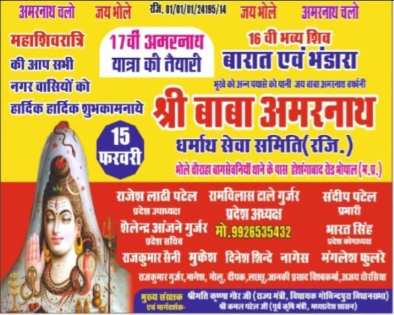 श्रीमती कृष्णा गौर जी (राज्य मंत्री एवं विधायक, गोविन्दपुरा विधानसभा) एवं श्री कमल पटेल जी (पूर्व कृषि मंत्री, मध्यप्रदेश शासन) का मार्गदर्शन प्राप्त रहेगा।आयोजक:श्री बाबा अमरनाथ धर्मार्थ सेवा समिति (पंजी.), भोपाल