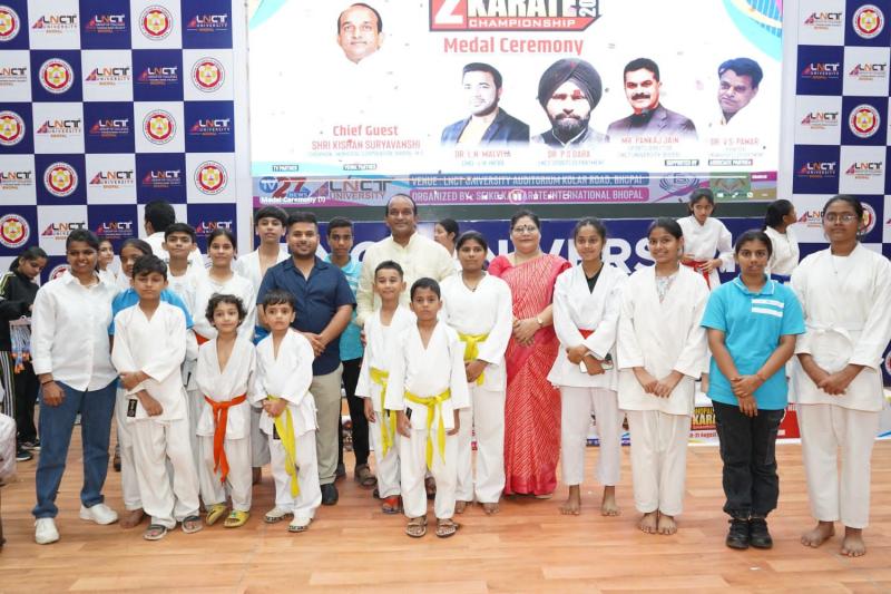भोपाल: सीको काई कराटे इंटरनेशनल भोपाल द्वारा आयोजित "द्वितीय भोपाल ओपन कराटे चैंपियनशिप 2025" का शानदार आयोजन LNCT यूनिवर्सिटी में हुआ। इस कार्यक्रम में नगर निगम अध्यक्ष श्री किशन सूर्यवंशी जी ने विजेता खिलाड़ियों को सम्मानित किया और समारोह को संबोधित करते हुए कराटे के महत्व पर प्रकाश डाला।