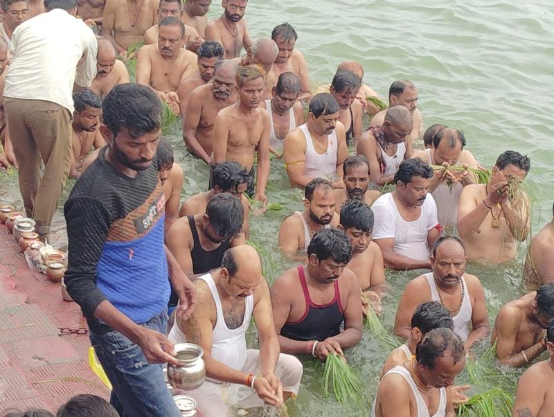 शीतलदास की बगिया में उमड़ी आस्था, तालाब में खड़े होकर किया पितरों का तर्पण