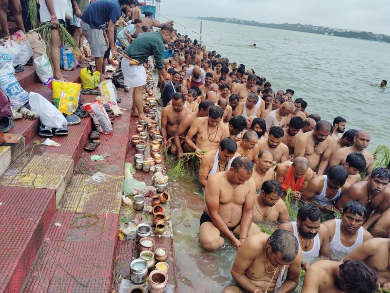 भोपाल। पितृपक्ष के प्रथम दिवस पूर्णिमा पर रविवार सुबह राजधानी भोपाल की शीतलदास की बगिया में हजारों की संख्या में सनातनी एकत्र हुए और श्रद्धा-भक्ति के साथ अपने पूर्वजों का तर्पण किया। इस अवसर पर श्रद्धालु तालाब में खड़े होकर घी, दूध, तिल, अक्षत और पुष्प अर्पित करते हुए पहले देवताओं, भगवान और ऋषियों को तर्पण समर्पित किया, तत्पश्चात अपने पितरों का विधिपूर्वक आह्वान कर अर्घ्य अर्पित किया।