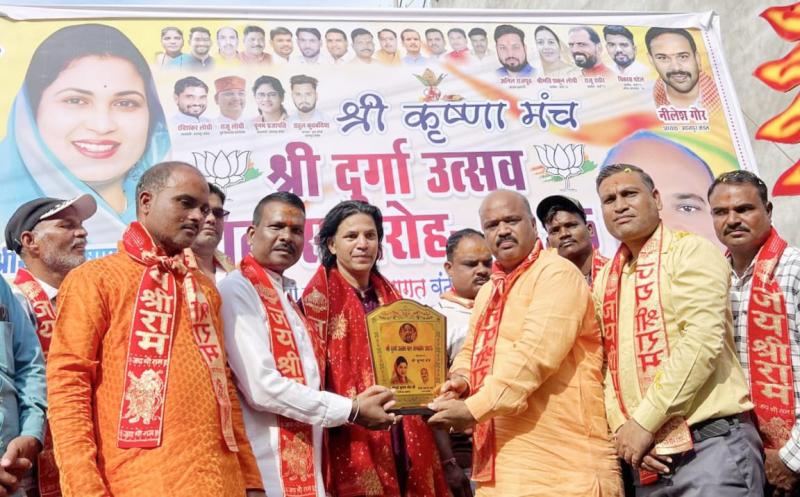 विद्यायक प्रतिनिधि विनोद साहू ने श्री कृष्णा मंच से दुर्गा जी झांकी अध्यक्षों का अंगवस्त्र ओढ़ाकर, स्मृति चिन्ह भेंटकर किया सम्मान