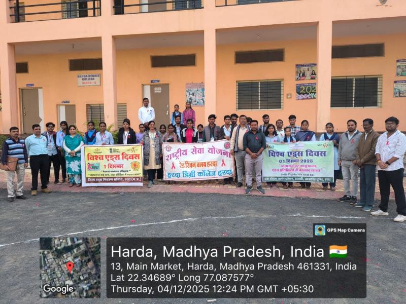हरदा/ मुख्य चिकित्सा अधिकारी डॉ. एच. पी. सिंह एवं नोडल अधिकारी डॉ. मृत्युंजय सिंह गहलोत के मार्गदर्शन में हरदा डिग्री कॉलेज हरदा के परिसर में गुरूवार को जिला एड्स नियंत्रण एवं रोकथाम समिति के सहयोग से हरदा डिग्री कॉलेज हरदा के रेड रिबन क्लब द्वारा मानव श्रृंखला के माध्यम एड्स लोगो बनाया गया। इस दौरान रंगोली, पोस्टर प्रतियोगिता का आयोजन भी किया गया। कार्यक्रम में रेड रिबन क्लब के सदस्यगण द्वारा ‘‘एड्स ज्ञान बचाए जान’’ विषय पर स्लोगन के माध्यम जागरुकता कार्यक्रम सम्पन्न किया गया। हरदा डिग्री कॉलेज की प्राचार्य डॉ. अभिलाषा सिंहल, राष्ट्रीय सेवा योजना के कार्यक्रम अधिकारी श्री सतेंद्र सिंह परिहार, असिस्टेंट प्रोफ़ेसर समाज कार्य डॉ. मनोरमा चौहान, श्री नीरज गुर्जर, प्रधानमंत्री कॉलेज ऑफ एक्सीलेंस हरदा से सहायक प्राध्यापक श्री सुमित शर्मा, श्री बलवान सिंह पवार सहित अन्य अधिकारी कर्मचारी व विद्यार्थीगण उपस्थित रहे।