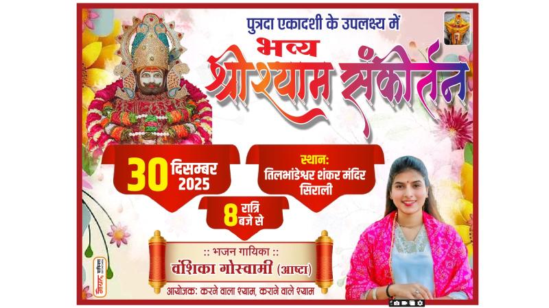 पुत्रदा एकादशी के पावन अवसर पर मंगलवार, 30 दिसंबर 2025 को तिलभांडेश्वर शंकर मंदिर, सिराली में भव्य श्रीश्याम संकीर्तन का आयोजन किया जाएगा। कार्यक्रम का शुभारंभ रात्रि 8 बजे से होगा।