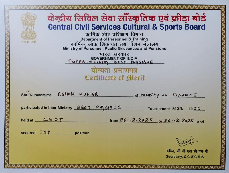 भोपाल परिवर्तन पार्टी ऑफ़ इंडिया राष्ट्रीय अध्यक्ष मोनू महेन्द्र सिंह रावत ने वित्त मंत्रालय के श्री अशोक कुमार के द्वारा अपने मंत्रालय का नाम रोशन करने पर हार्दिक एवं शुभकामनाएं दी उन्होंने कहा कि सेंट्रल सिविल सर्विसेज कल्चरल एंड स्पोर्ट्स बोर्ड (CCSCSB) द्वारा आयोजित इंटर-मिनिस्ट्री बेस्ट फिजिक चैंपियनशिप 2025-26 में गोल्ड मेडल जीता है. बता दें कि यह प्रतिष्ठित चैंपियनशिप 25-26 दिसंबर 2025 को CSOT में आयोजित की गई थी. यहां कई अलग-अलग मंत्रालयों के प्रतिभागियों ने बेहतरीन फिजिकल फिटनेस, डिस्प्लेन और डेडिकेशन का प्रदर्शन किया.
