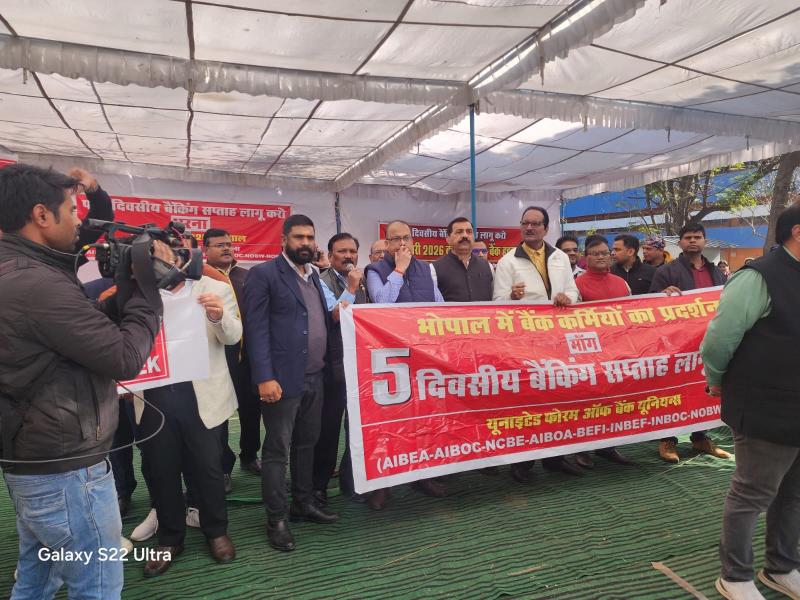 भोपाल में बैंक कर्मियों का जोरदार धरना प्रदर्शन पाँच दिवसीय बैंकिंग सप्ताह लागू करने की मांग बुलंद