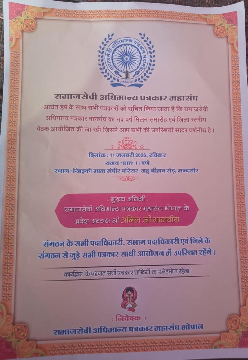 मंदसौर। समाजसेवी अधिमान्य पत्रकार महासंघ द्वारा नववर्ष के उपलक्ष्य में मिलन समारोह एवं जिला स्तरीय बैठक का आयोजन किया जा रहा है। यह आयोजन रविवार, 11 जनवरी 2026 को प्रातः 11 बजे से खिड़की माता मंदिर परिसर, महू-नीमच रोड, मंदसौर में संपन्न होगा।