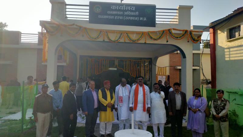 हरदा / भारत सरकार के अनुसूचित जनजाति कार्य विभाग के केन्द्रीय राज्य मंत्री श्री दुर्गादास उईके सोमवार को वनमण्डल कार्यालय (उत्पादन) के 90.50 लाख रूपये की लागत से नवनिर्मित अत्याधुनिक भवन के उद्घाटन समारोह में मुख्य अतिथि के रूप में सम्मिलित हुए। गरिमामय समारोह के दौरान उन्होंने विधिवत पूजा-अर्चना और पट्टिका का अनावरण कर नए कार्यालय भवन का लोकार्पण किया। इस अवसर पर क्षेत्रीय विधायक डॉ. आर. के. दोगने, जिला पंचायत अध्यक्ष श्री गजेन्द्र शाह, पूर्व कृषि मंत्री श्री कमल पटेल, भाजपा जिला अध्यक्ष श्री राजेश वर्मा, पूर्व विधायक टिमरनी श्री संजय शाह, पुलिस अधीक्षक श्री शशांक, मुख्य वन संरक्षक वनवृत्त नर्मदापुरम श्री अशोक कुमार, वनमण्डलाधिकारी श्री नरेंद्र पण्डवा व श्री अनिल चौपड़ा सहित अन्य वरिष्ठ प्रशासनिक अधिकारी और स्थानीय जनप्रतिनिधि उपस्थित रहे। कार्यक्रम के अंत में विभाग द्वारा अतिथियों को स्मृति चिन्ह भेंट कर सम्मानित किया गया और परिसर में पौधारोपण भी किया गया। इस दौरान अतिथियों ने रूद्राक्ष का पौधारोपण किया।