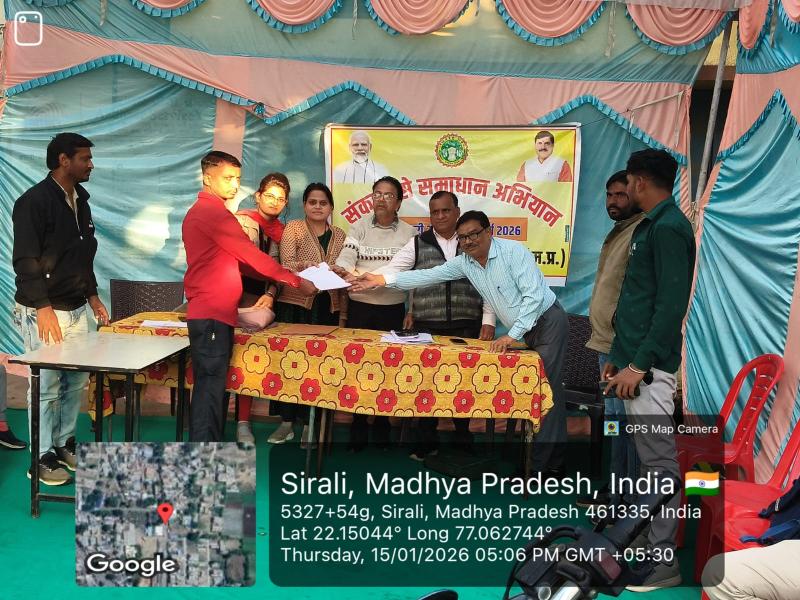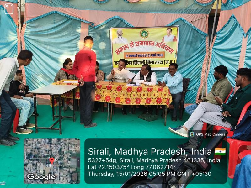 मध्यप्रदेश शासन की विभिन्न जनकल्याणकारी योजनाओं एवं सेवाओं में पात्र हितग्राहियों को समय-सीमा में लाभ प्रदान करने के उद्देश्य से संकल्प से समाधान अभियान के अंतर्गत नगर परिषद सिराली द्वारा दिनांक 15 जनवरी 2026 को तीन स्थानों पर शिविर आयोजित किए गए।