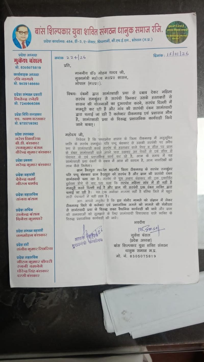 भोपाल बांस शिल्पकार युवा शक्ति संगठन धानुक समाज के प्रदेश अध्यक्ष मुकेश बंसल ने मध्यप्रदेश के जिला टीकमगढ़ की ग्राम पंचायत हैदरपुरा (तहसील बड़ागाँव) में प्रशासनिक लापरवाही पर सवाल उठाते हुये दंबंगों द्वारा सामंतशाही प्रथा से दबााव बनाकर महिला संरपंच के साथ हुई अन्यायपूर्ण कार्यवाही पर कडी आपत्ति दर्ज करायी हैा उन्होंने कहा कि सरपंच पद पर निर्वाचित अनुसूचित जाति की महिला सरपंच, रामकुंवर पति पप्पू बंशकार दबंगों के सामंतवादी दबाव के कारण दिल्ली में मजदूरी करने को विवश हैं । वहीं उक्त महिला के स्थान पर गांव के कुछ रसूखदार दबंग अपनी दंबंगाई दिखाकर उनकी पंचायत का संचालन खुलेआम कर रहे हैं।