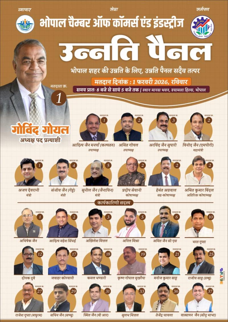 भोपाल चैम्बर ऑफ कॉमर्स एंड इंडस्ट्रीज के आगामी चुनावों को लेकर व्यापारिक जगत में उत्साह का माहौल है। इस बार उन्नति पैनल ने संगठित व्यापार, सेवा भावना और व्यापारी एकरूपता को केंद्र में रखते हुए अपने अध्यक्ष पद के प्रत्याशी के रूप में गोविंद गोयल जी को मैदान में उतारा है।