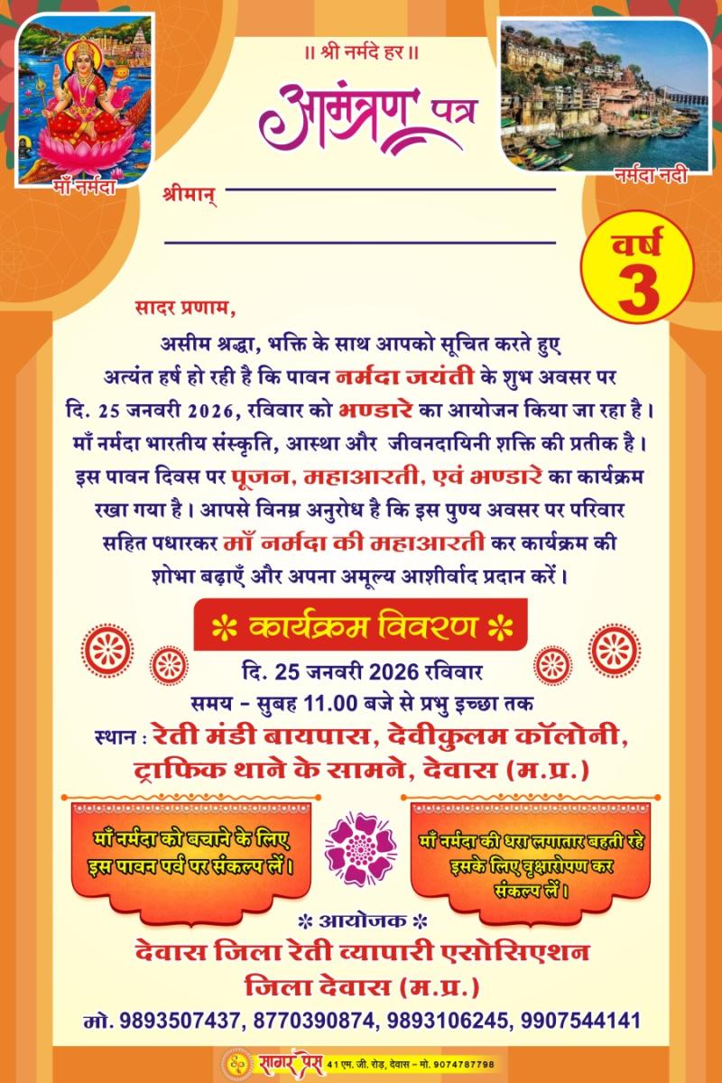 देवास। पावन नर्मदा जयंती के शुभ अवसर पर देवास नगर में श्रद्धा, भक्ति और आस्था के साथ भव्य धार्मिक आयोजन किया जा रहा है। देवास जिला रेटी व्यापारी एसोसिएशन के तत्वावधान में रविवार 25 जनवरी 2026 को माँ नर्मदा की महाआरती, पूजन एवं विशाल भंडारे का आयोजन होगा।