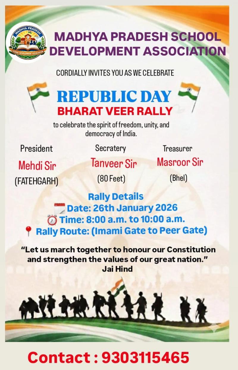भोपाल मध्य प्रदेश स्कूल विकास संघ द्वारा 26 जनवरी 2026, सोमवार को गणतंत्र दिवस के अवसर पर भारतवीर रैली का आयोजन किया जा रहा है। यह रैली देश की स्वतंत्रता, एकता और लोकतंत्र की भावना का उत्सव मनाने हेतु आयोजित की जा रही है।