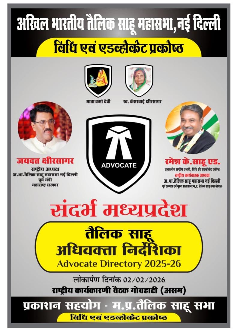 भोपाल/अखिल भारतीय तैलिक साहू महासभा नई दिल्ली के राष्ट्रीय कार्यकारी अध्यक्ष श्री रमेश के साहू एडवोकेट द्वारा मध्यप्रदेश के तैलिक साहू समाज के अधिवक्ताओं की जानकारी को संकलित करते हुए ‘संदर्भ मध्यप्रदेश’ एडवोकेट डायरेक्टरी 2025-26 का निर्माण किया गया है। इस महत्वपूर्ण अधिवक्ता निर्देशिका का विमोचन गुवाहाटी (असम) में महासभा के राष्ट्रीय अध्यक्ष श्री जयदत्त क्षीरसागर के करकमलों से किया जाएगा।