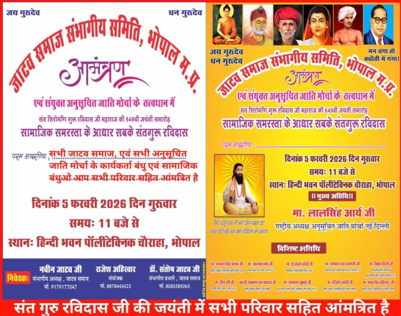 जाटव समाज संगठनीय समिति, भोपाल द्वारा संयुक्त अनुसूचित जाति मोर्चा के तत्वावधान में 5 फरवरी 2026, गुरुवार को प्रातः 11 बजे से हिंदी भवन, पॉलिटेक्निक चौराहा, भोपाल में भव्य जयंती समारोह आयोजित किया जाएगा। कार्यक्रम का मुख्य विषय “सामाजिक समरसता के आधार संत गुरु रविदास” रहेगा।