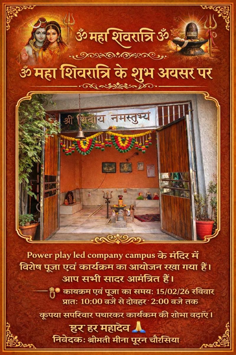 पावर प्ले एलईडी कंपनी कैंपस मंदिर में महाशिवरात्रि पर विशेष पूजा एवं धार्मिक कार्यक्रम 15 फरवरी को