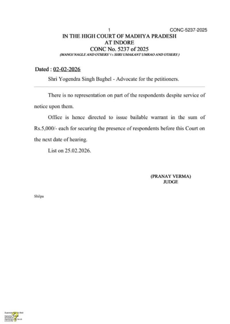 नोटिस जारी होने के बावजूद विभागीय अधिकारी न्यायालय में उपस्थित नहीं हुए, जिस पर मध्य प्रदेश उच्च न्यायालय, इंदौर खंडपीठ ने सख्त रुख अपनाते हुए संबंधित अधिकारियों के विरुद्ध 5 हजार रुपये के जमानती वारंट जारी किए हैं। न्यायालय की इस कार्रवाई को भर्ती प्रक्रिया में लापरवाही एवं आदेशों की अवहेलना के रूप में देखा जा रहा है। अभ्यर्थियों का कहना है कि जब रिक्त पदों की संख्या 191 से अधिक है और न्यायालय के स्पष्ट निर्देश मौजूद हैं, तब भी विभाग द्वारा संशोधित परिणाम एवं विस्तृत प्रतीक्षा सूची जारी न करना नियमसम्मत नहीं है, अतः न्यायालय के निर्देशों के अनुरूप पारदर्शी एवं न्यायोचित कार्रवाई सुनिश्चित की जाए।