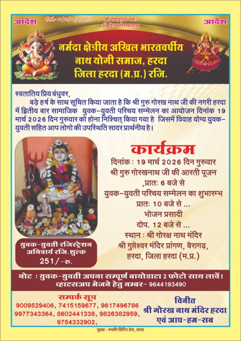 नर्मदा क्षेत्रीय अखिल भारतवर्षीय नाथ योगी समाज, हरदा द्वारा सामाजिक समरसता को बढ़ावा देने और विवाह योग्य युवक-युवतियों को एक मंच उपलब्ध कराने के उद्देश्य से द्वितीय युवक-युवती परिचय सम्मेलन का आयोजन किया जा रहा है। यह सम्मेलन 19 मार्च 2026, गुरुवार को हरदा स्थित श्री गोरक्षनाथ मंदिर, श्री गुहेश्वर मंदिर प्रांगण, बैरागढ़ में आयोजित होगा। कार्यक्रम को लेकर समाज के लोगों में उत्साह का माहौल है और तैयारियां अंतिम चरण में हैं।