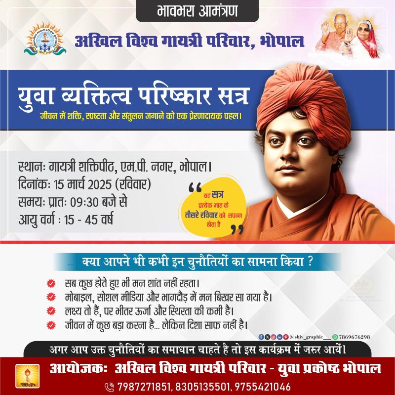 इसी दिन आदरणीय अमर धाकड़ जी (प्रांतीय सह समन्यवक युवा प्रकोष्ठ) के मार्गदर्शक में व जिला युवा समन्वयक डॉ दयानन्द समेले जी, अनमोल पाठक जी(युवा सहसमन्वयक) पंकेश जी, गोपाल जी, साथ ही विशेष राजूराम जी के नेतृत्व में पूरी युवा प्रकोष्ठ टीम युवाओं के व्यक्तित्व विकास और सकारात्मक जीवनदृष्टि के लिए “युवा व्यक्तित्व परिष्कार सत्र” का भी आयोजन किया जाएगा। यह सत्र प्रातः 9:30 बजे से 12 बजे तक गायत्री शक्तिपीठ, एम.पी. नगर में आयोजित होगा, जिसमें युवाओं को जीवन प्रबंधन, आत्मविकास और संस्कारमय जीवन के लिए प्रेरित किया जाएगा । इसमें अभिषेक परमार ( मीडिया प्रभारी ) की भी खास उपस्थिति रहेगी ।