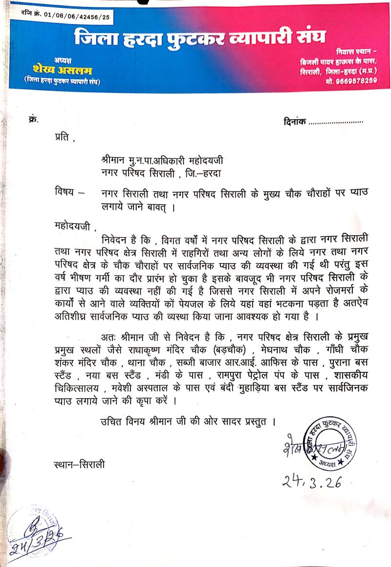 सिराली। गर्मी के तेवर तेज होते ही नगर में पेयजल संकट की आहट महसूस होने लगी है। ऐसे में आमजन को राहत दिलाने के उद्देश्य से जिला हरदा फुटकर व्यापारी संघ, सिराली ने नगर परिषद के समक्ष जोरदार पहल करते हुए शहर के प्रमुख स्थानों पर सार्वजनिक प्याऊ लगाए जाने की मांग उठाई है। संघ द्वारा इस संबंध में एक विस्तृत ज्ञापन नगर परिषद अधिकारियों को सौंपा गया।