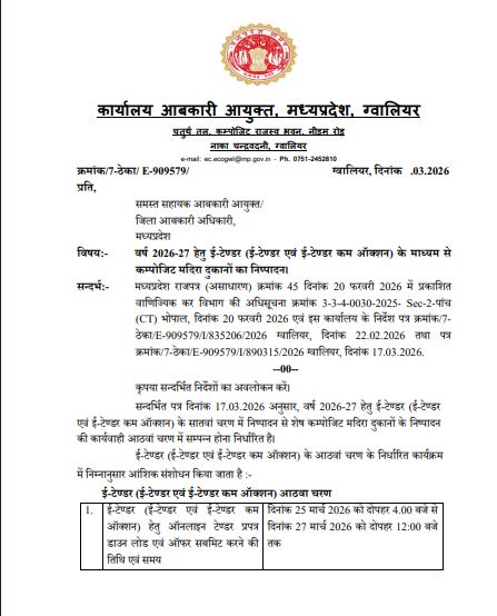 भोपाल/ग्वालियर। मध्यप्रदेश में वित्तीय वर्ष 2026-27 के लिए कम्पोजिट मदिरा दुकानों के निष्पादन हेतु ई-टेंडर प्रक्रिया का आठवां चरण शुरू कर दिया गया है। आबकारी आयुक्त दीपक सक्सेना द्वारा जारी संशोधित कार्यक्रम के अनुसार, इस चरण में शेष बची दुकानों और समूहों का आवंटन किया जाएगा। संशोधित कार्यक्रम के मुताबिक, ऑनलाइन टेंडर डाउनलोड और ऑफर सबमिट करने की प्रक्रिया 25 मार्च शाम 4 बजे से शुरू होकर 27 मार्च दोपहर 12 बजे तक चलेगी। इसी दिन दोपहर बाद ई-टेंडर कम ऑक्शन की प्रक्रिया शुरू होगी, जिसमें शाम 4:30 बजे से 5:30 बजे तक बोली लगेगी। यदि अंतिम समय में बोली आती है, तो हर 15 मिनट में समय बढ़ाया जाएगा।
