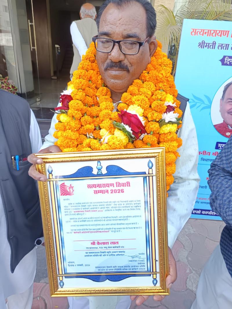 भोपाल। मध्य प्रदेश लघु वेतन कर्मचारी संघ के उपरांत अध्यक्ष कैलाश लाल को उनके लंबे सामाजिक एवं संगठनात्मक योगदान के लिए स्वर्गीय सत्यनारायण तिवारी राष्ट्रीय बेस्ट अचीवमेंट अवार्ड से सम्मानित किया