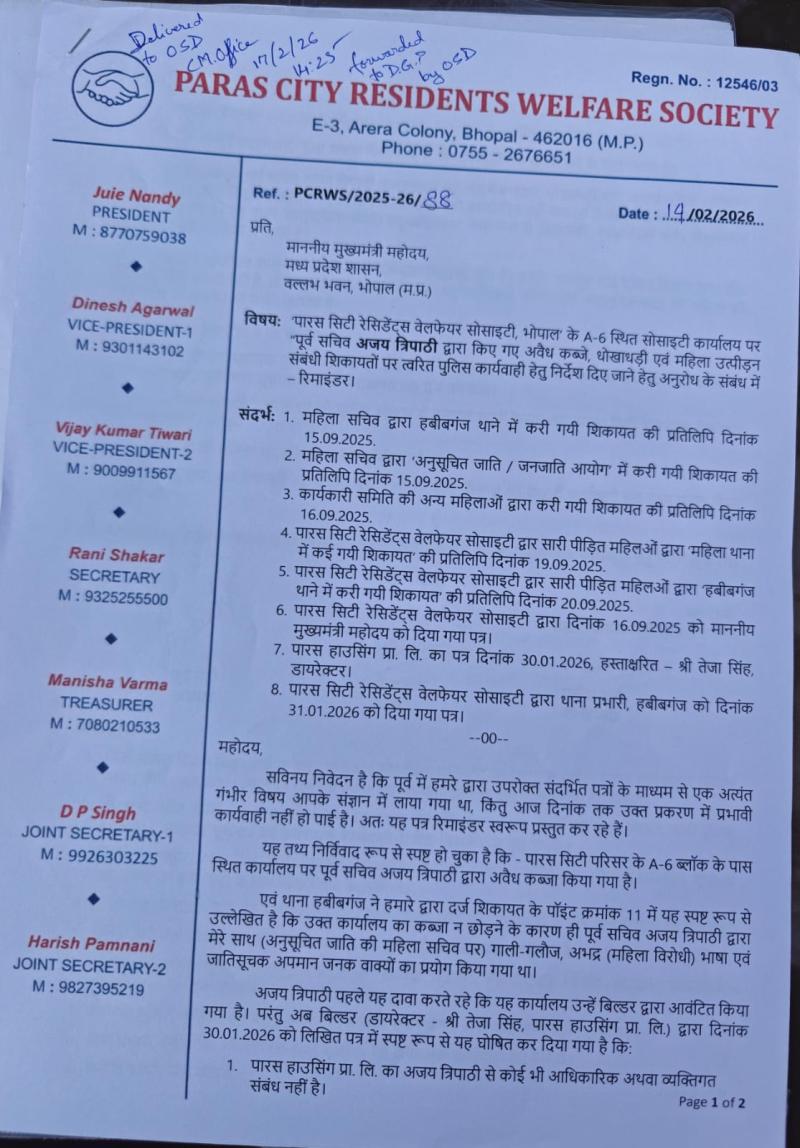 भोपाल। भोपाल के पारस सिटी परिसर (ई-3 अरेरा कॉलोनी) स्थित सोसाइटी कार्यालय को लेकर विवाद अब कलेक्टर की जनसुनवाई तक पहुंच गया है।