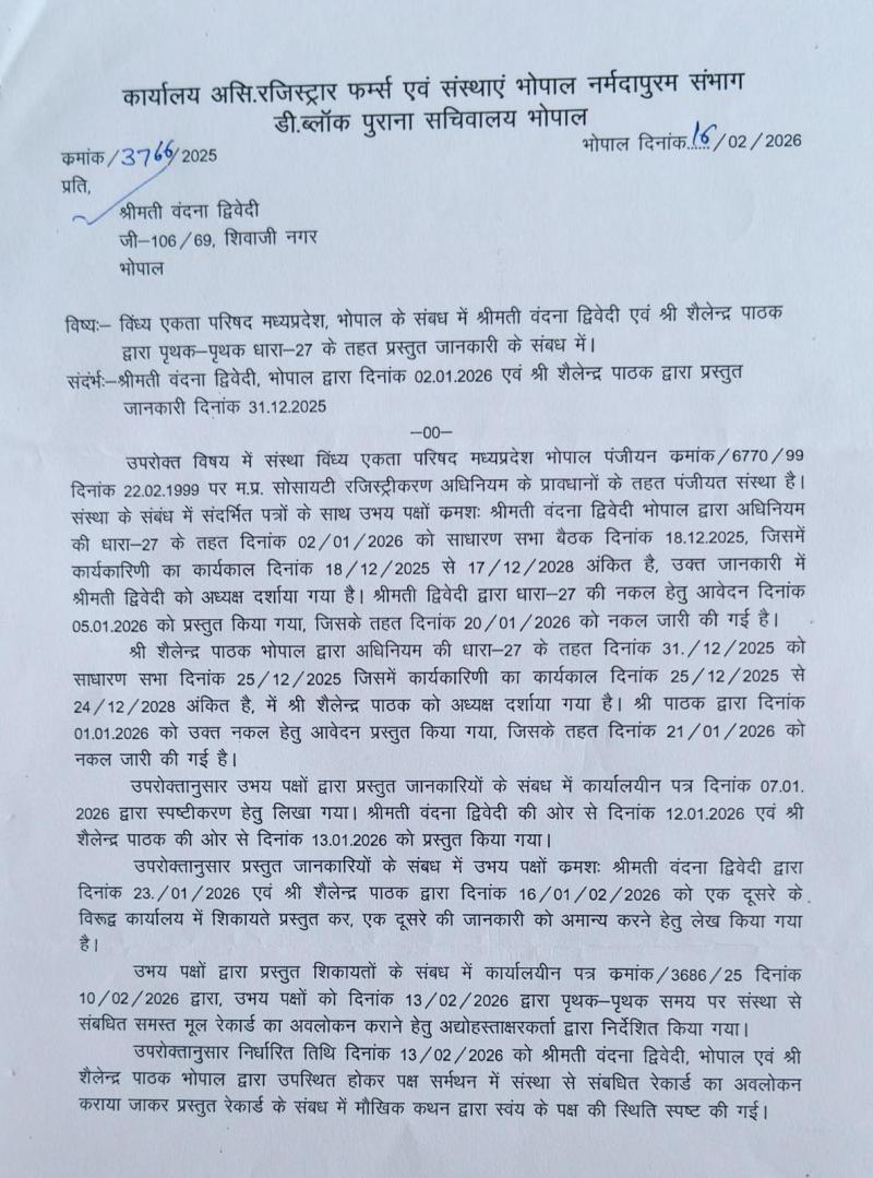 भोपाल,विंध्य एकता परिषद् (पंजीयन क्र.: 6770/99) की प्रदेश कार्यकारिणी को लेकर चल रहे विवाद पर अब आधिकारिक मुहर लग गई है। रजिस्ट्रार फर्म्स एवं सोसायटीज ने दिनांक 16/02/2026 को जारी पत्र के माध्यम से श्रीमती वंदना द्विवेदी के नेतृत्व में गठित प्रदेश कार्यकारिणी को मान्यता प्रदान कर दी है।