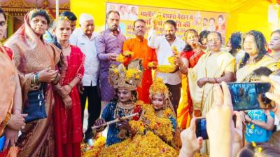 होली मिलन समारोह में राधा कृष्ण के स्वरूपों ने खेली फूलों की होली कार्यक्रम में शामिल हुये बालिस्ता रावत ।