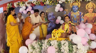 भोपाल श्री लक्ष्मीनारायण (बिड़ला) मंदिर में सजावट और व्यासपीठ पर फूलों का श्रृंगार, भक्तों के...