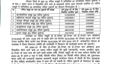भोपाल जिले के 7 मदिरा समूहों का ई-टेंडर से होगा निपटान 02 मार्च 2026 को दोपहर 2 बजे खुलेगा टेंडर, 27 फरवरी तक जमा होंगे आवेदन